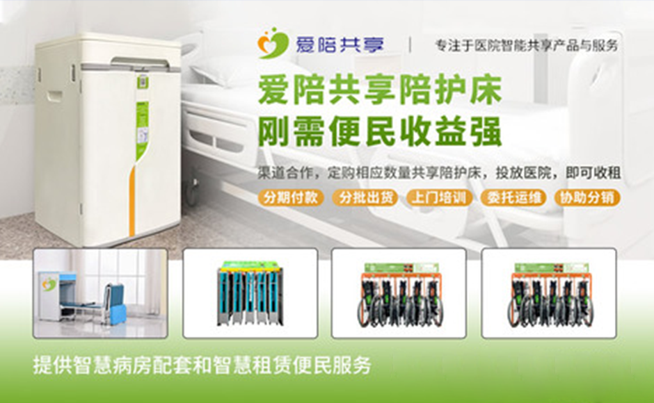 爱陪共享产品与服务已经供入广东省人民医院、中山大学附属第一医院、中山大学附属第一(南沙)医院、中山大学附属第三医院岭南医院、南方医科大学第五附属医院、广州医科大学附属肿瘤医院、广州医科大学附属第五医院、广东省中西医结合医院、广州市中西医结合医院、长沙市第一医院、陕西省人民医院、南昌大学附属第一医院、新疆医科大学附属第一医院、第六医院等 120 多家医院提供智慧病房配套和智慧租赁便民服务。